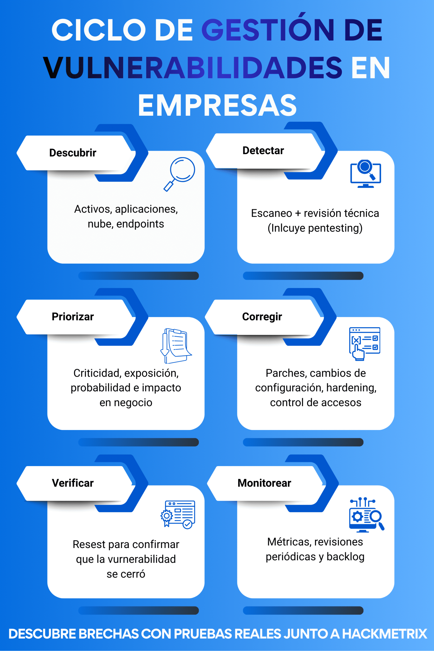 Para reducir la exposición de forma continua, sugerimos un ciclo de: identificar, priorizar, corregir, verificar y monitorear.